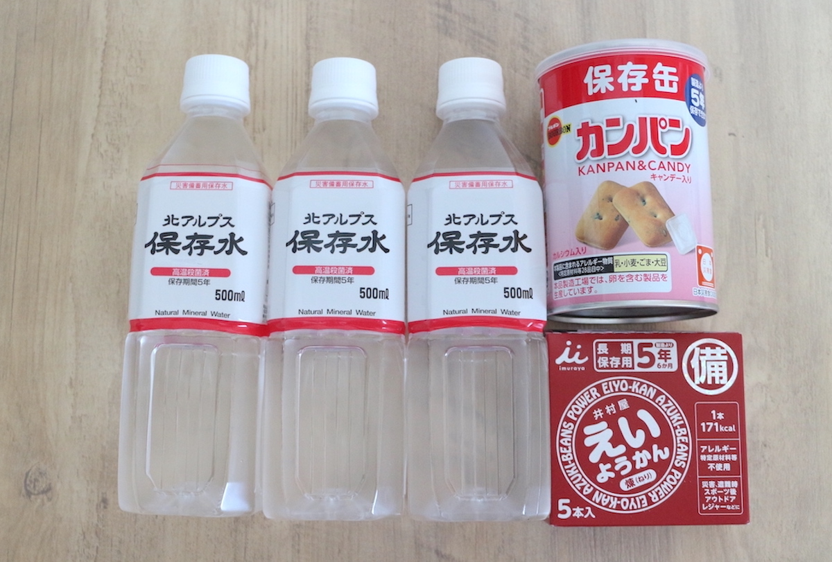 お水は500ml×3本、カンパンが1缶、5本入りのえいようかん