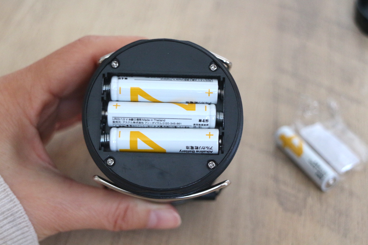 電池式なので、底面を開けて、付属の単4電池を3本セットします。