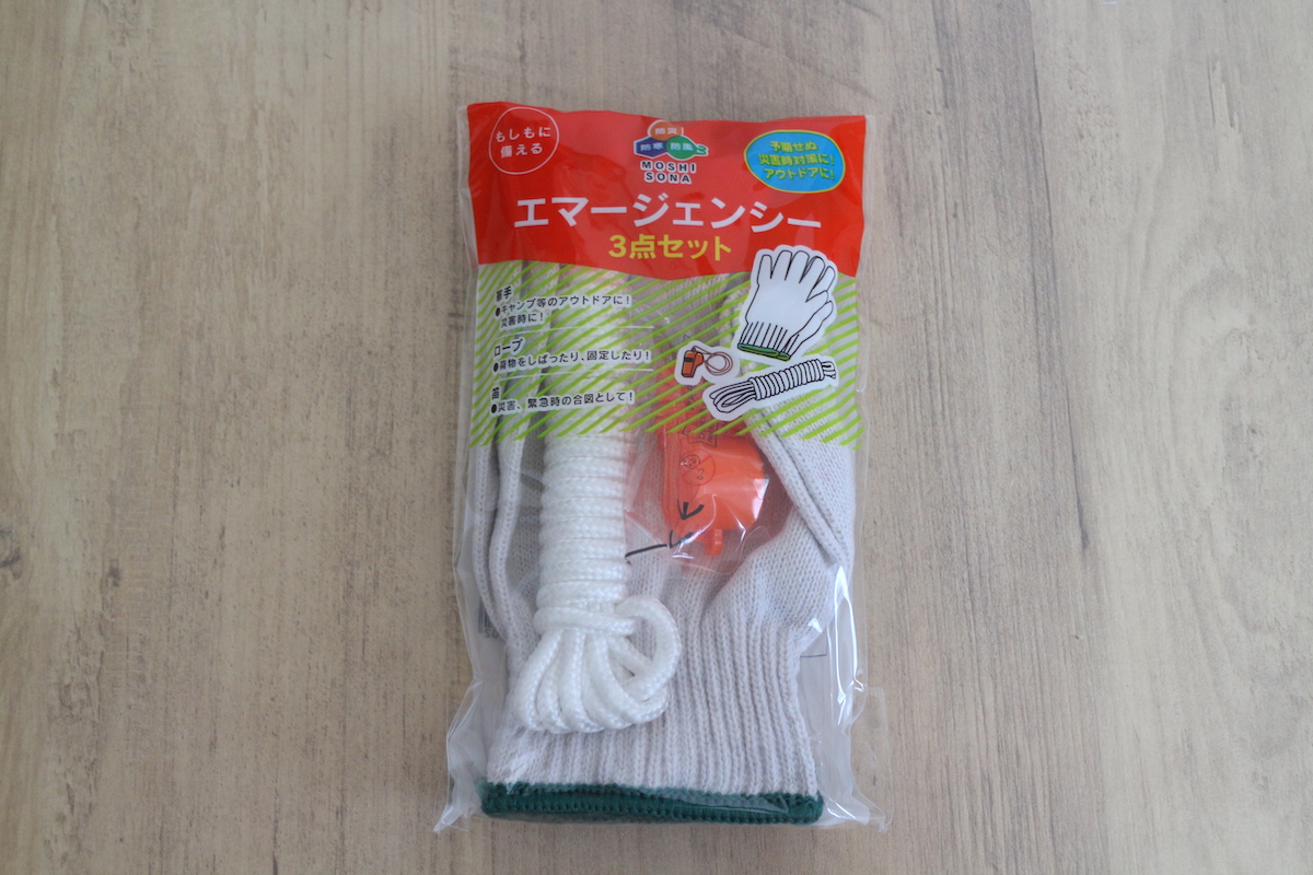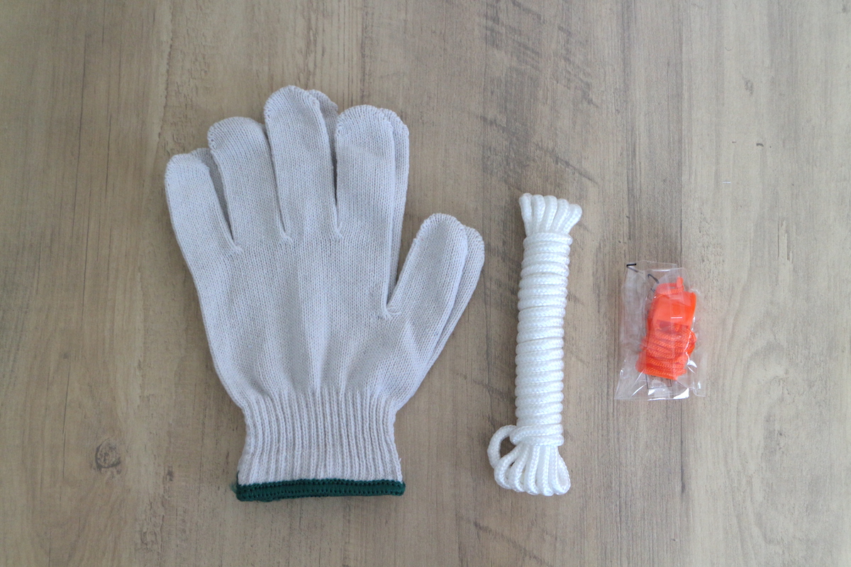 エマージェンシー3点セットの中身は軍手、ロープ、笛が入っています。