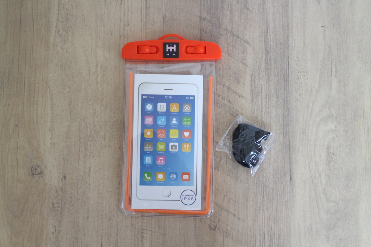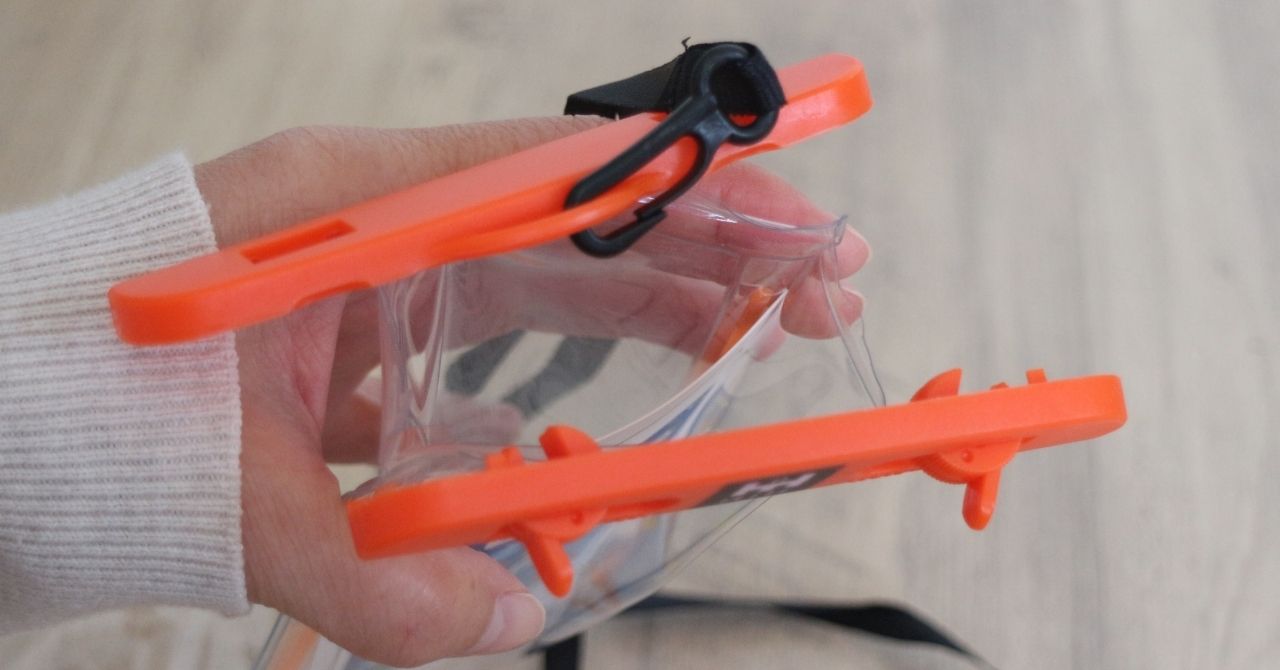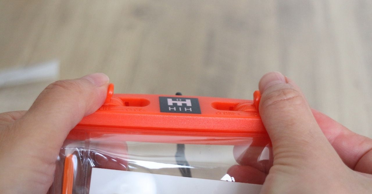 ケースの中にスマホを入れて、金具でしっかり密封できます。
