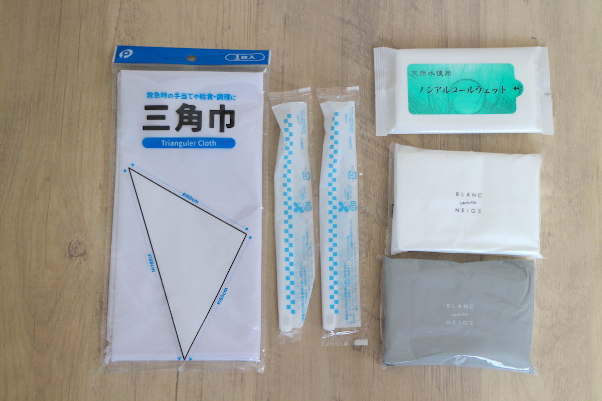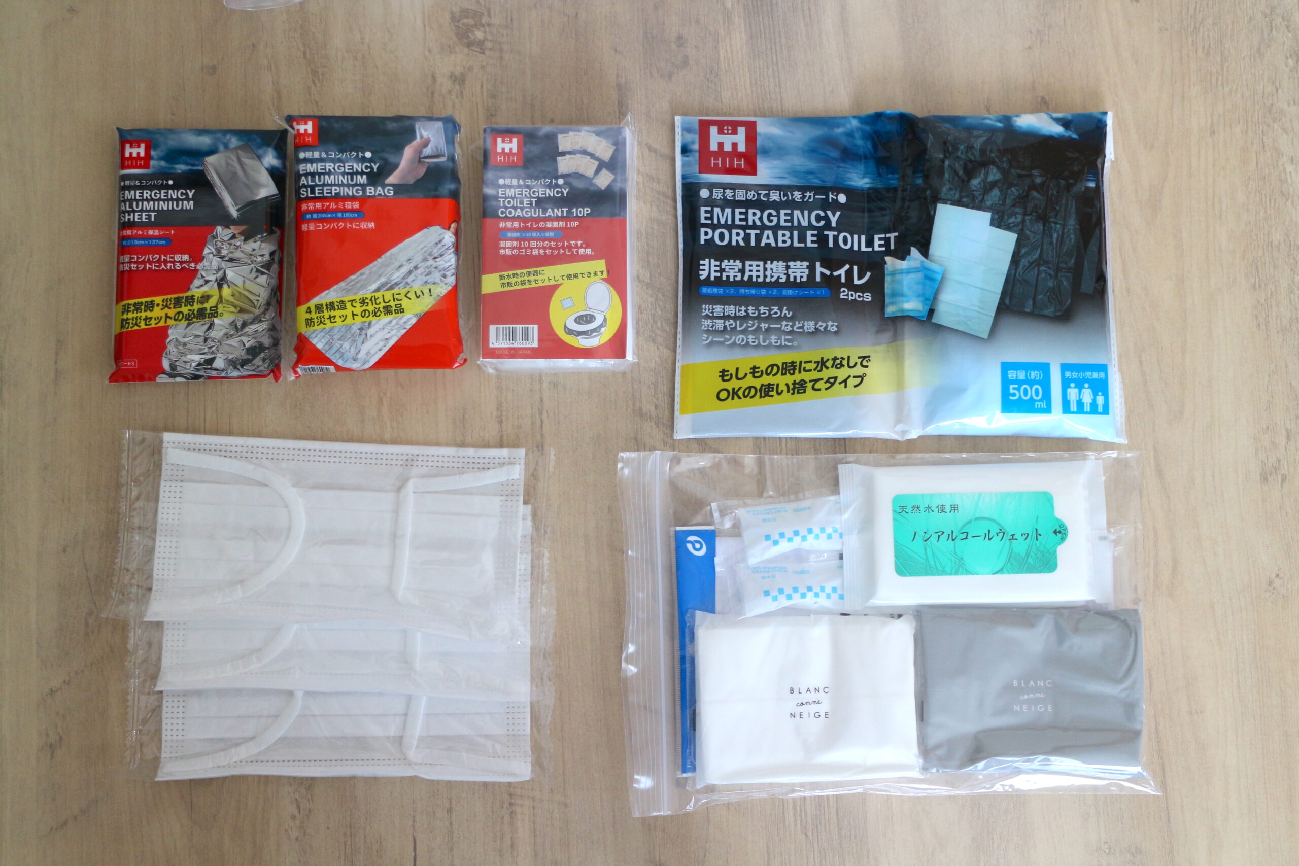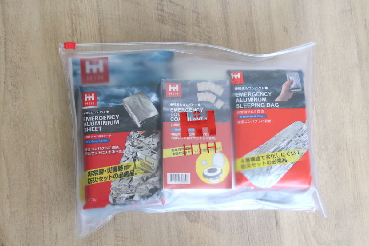 中身は、緊急用アルミ寝袋、アルミ保温シート、トイレの凝固剤、非常用携帯トイレ、マスク3枚、三角巾、歯ブラシ2本、ウエットティッシュ、ポケットティッシュ2つが入っています。