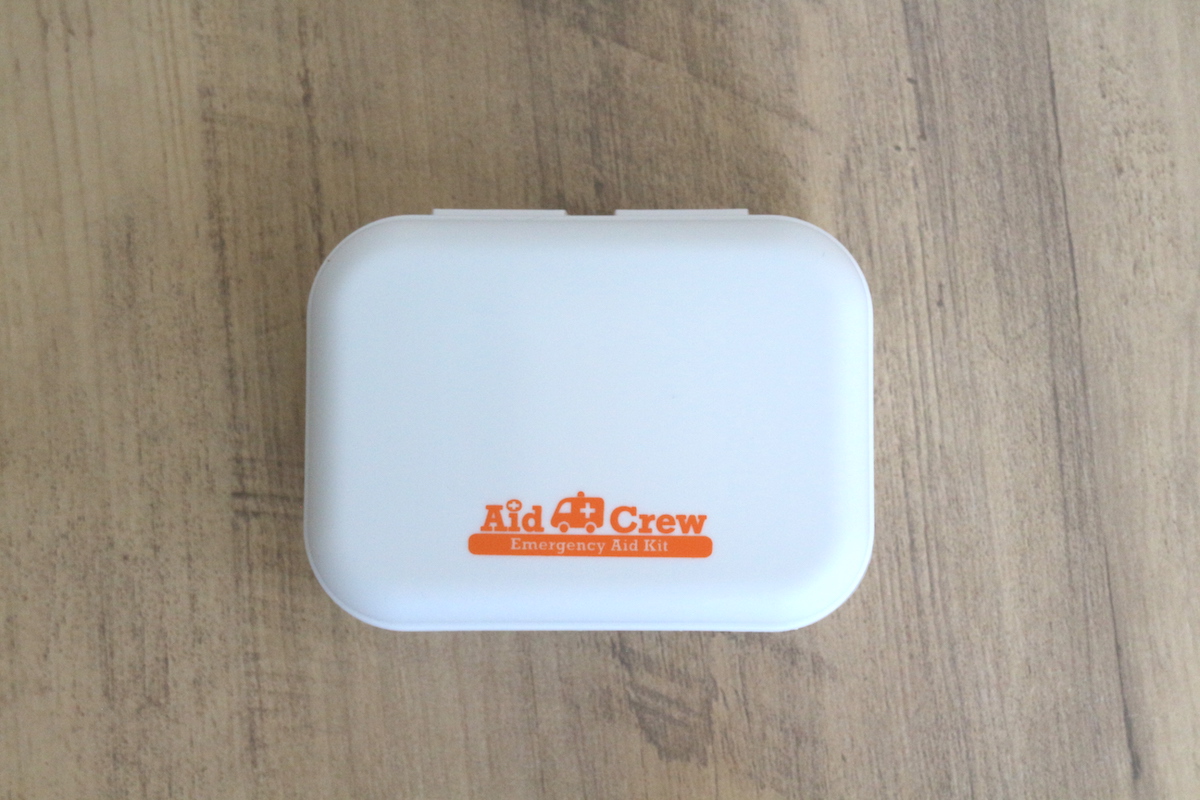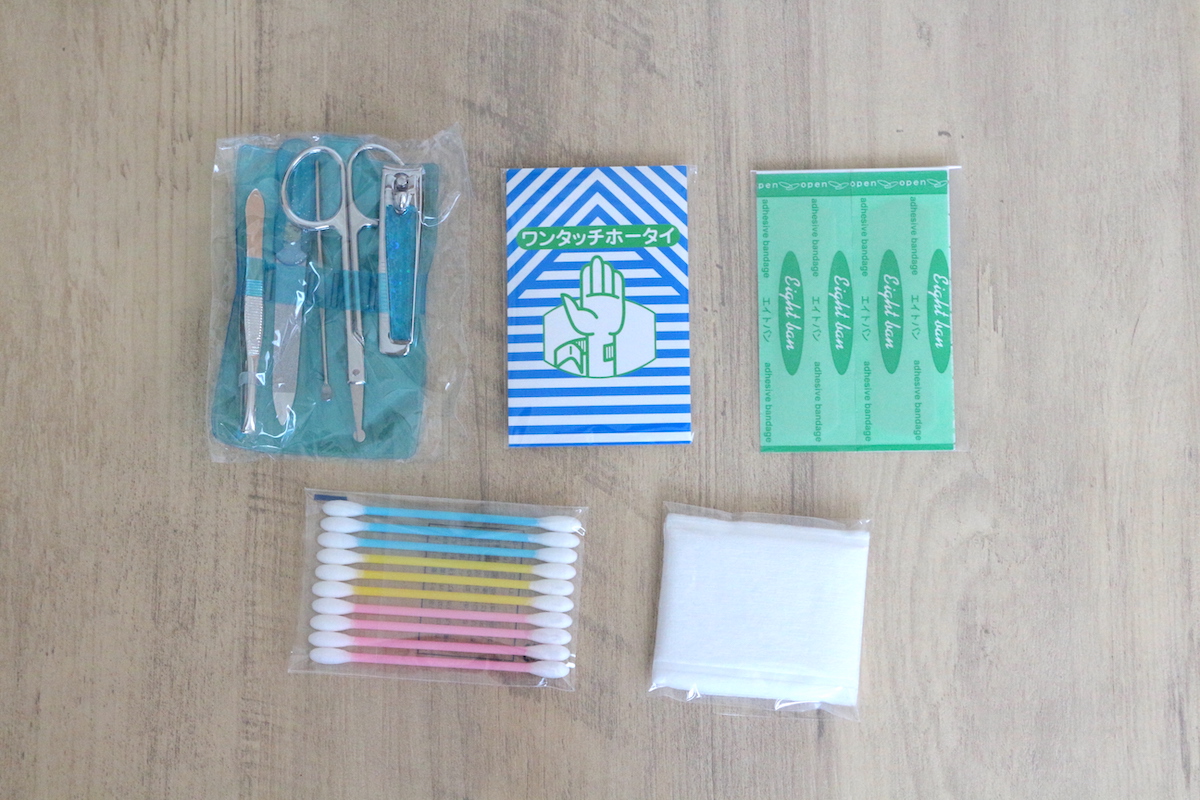 中身は、爪切り、エチケットはさみ、耳かき、毛抜き兼ピンセット、爪やすり、傷テープ3枚、綿棒10本、ワンタッチ包帯、コットンパフ3枚です。