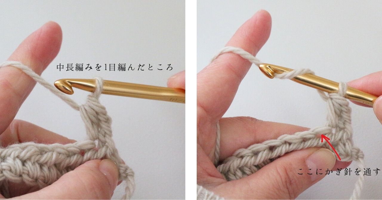 矢印のところにかぎ針を通し、中長編みを編みます。