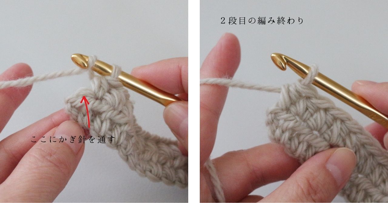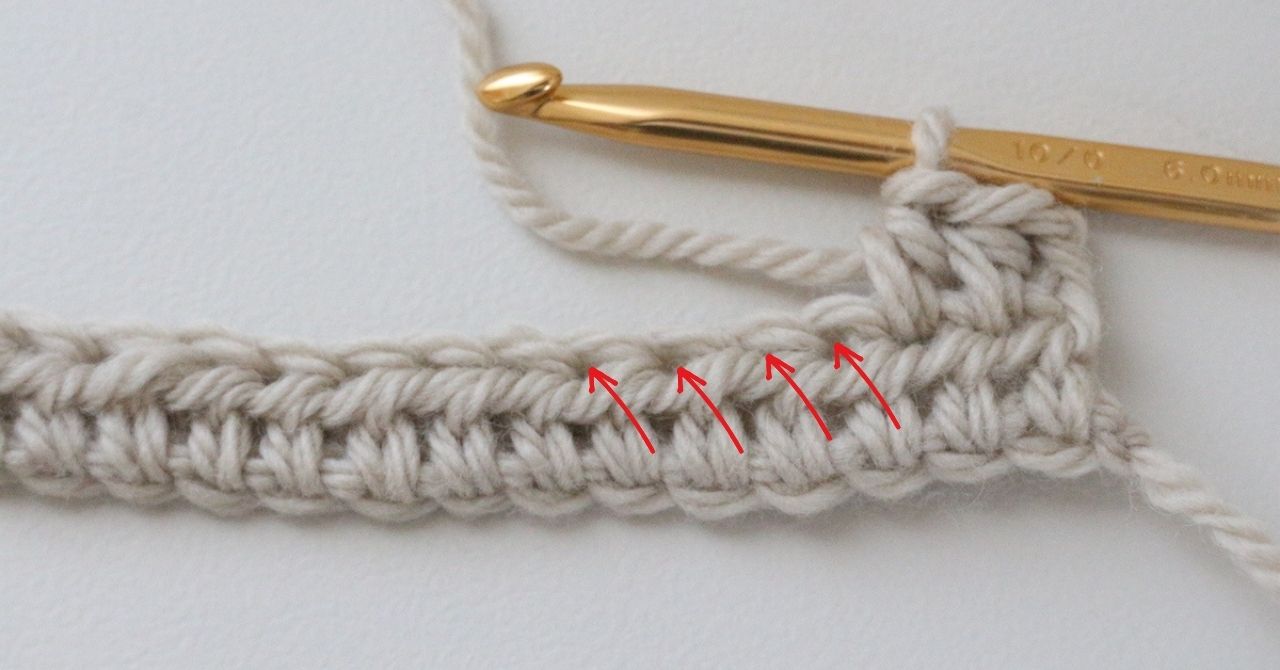 同じようにして、前段の中長編みの頭(矢印のところ)にかぎ針を通して中長編みを編みます。