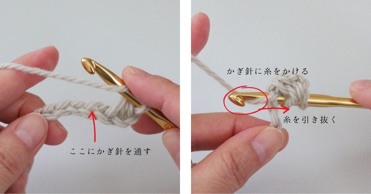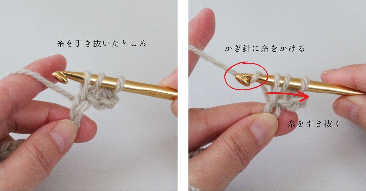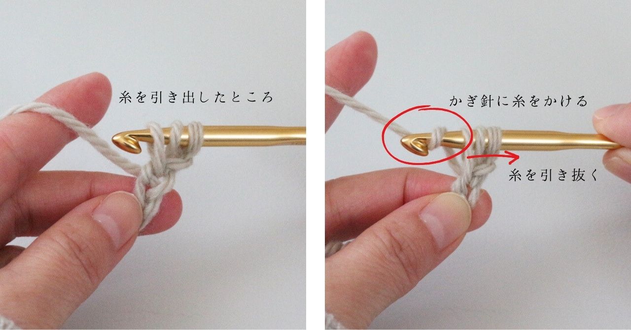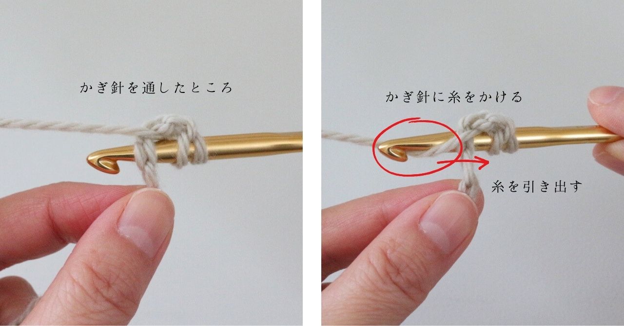 かぎ針を通したら、糸をかけて、鎖編みから引き出します。