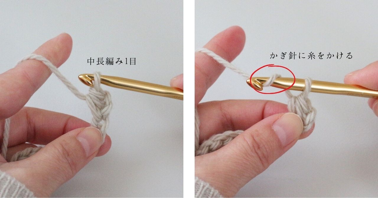 同じことを繰り返して1段目を全て中長編みで編んでください。