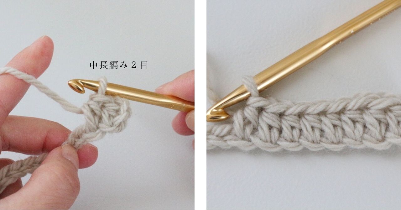 これで「中長編み」が1目編めました。同じようにして、中長編みを編みます。