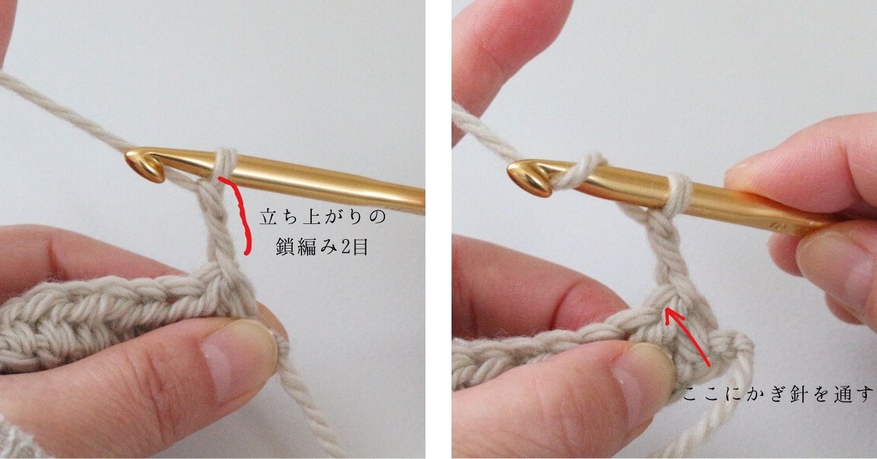 編み地を裏返して持ち、立ち上がりの鎖編みを2目編みます。