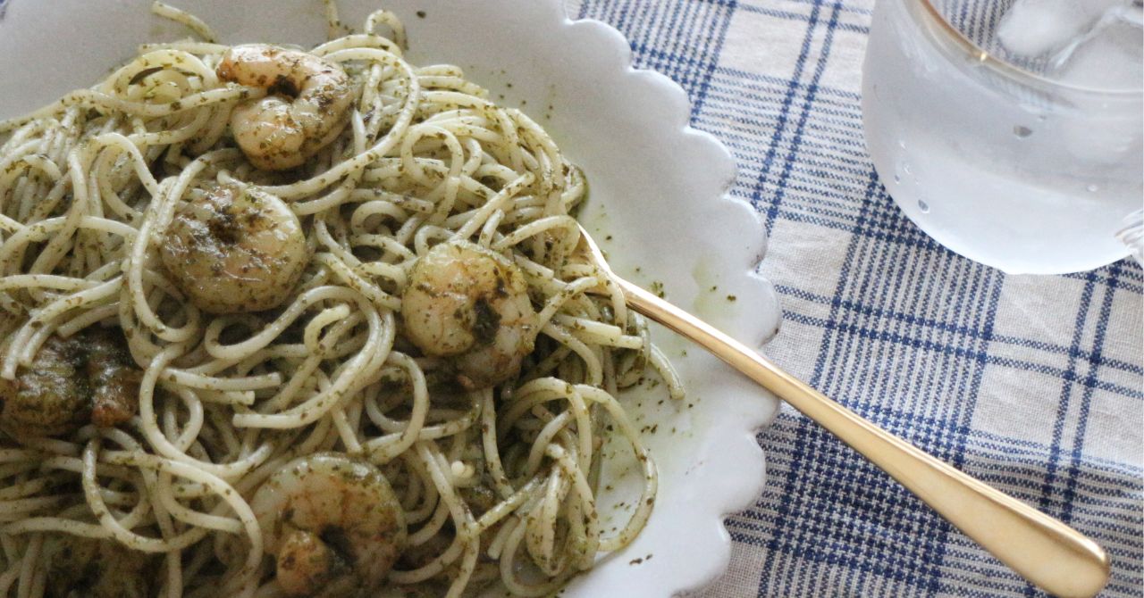 今夜はえびのジェノベーゼパスタ。