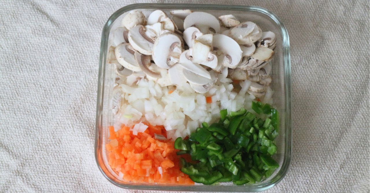 ③にんじん、玉ねぎ、ピーマンはみじん切り、マッシュルームは薄くスライスします。