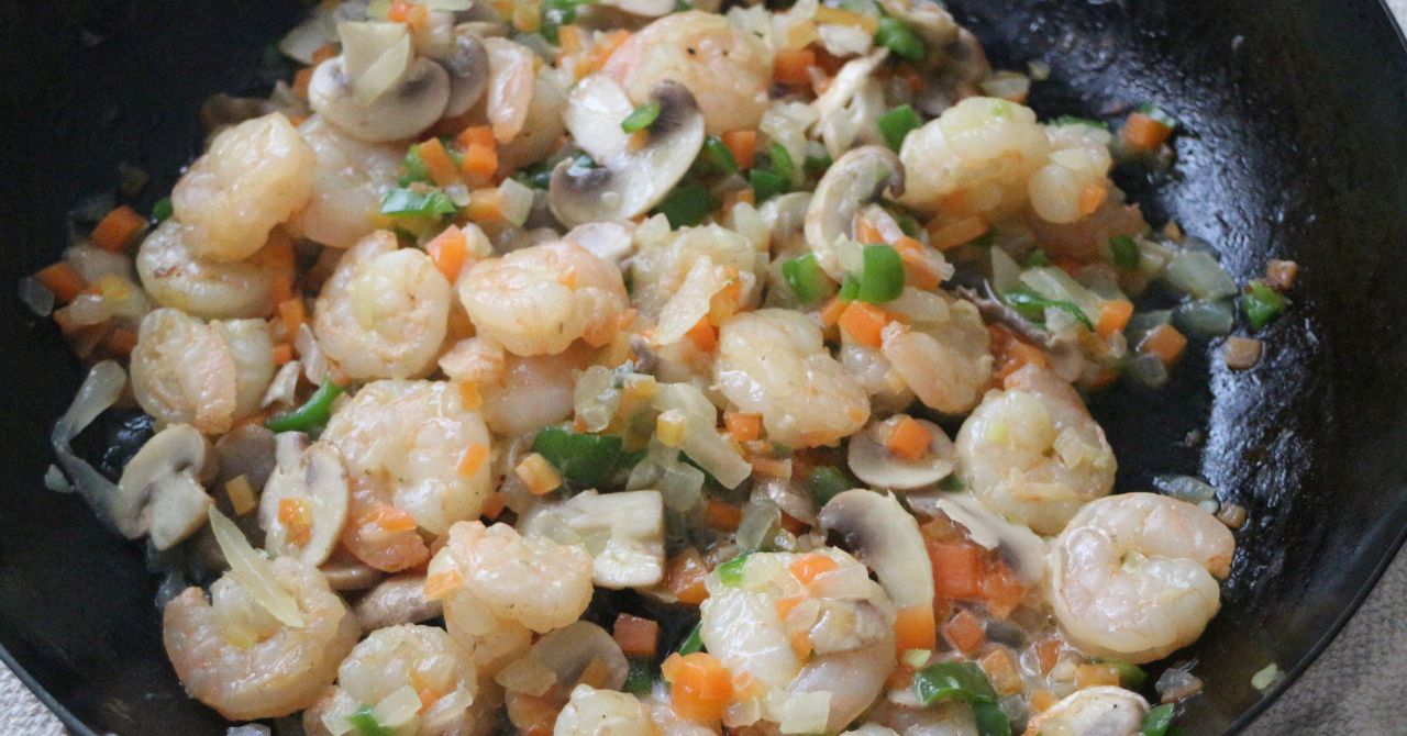 ④熱したフライパンに油をひいて、えび、にんじん、玉ねぎ、ピーマン、マッシュルームを炒めます。お酒と塩を加えよく炒めます。最後にパターを加えます。