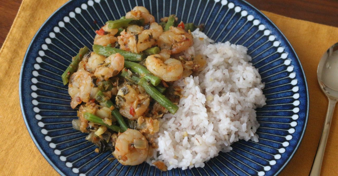 ひき肉のかわりにエビを使って、エビガパオライスを作りました。