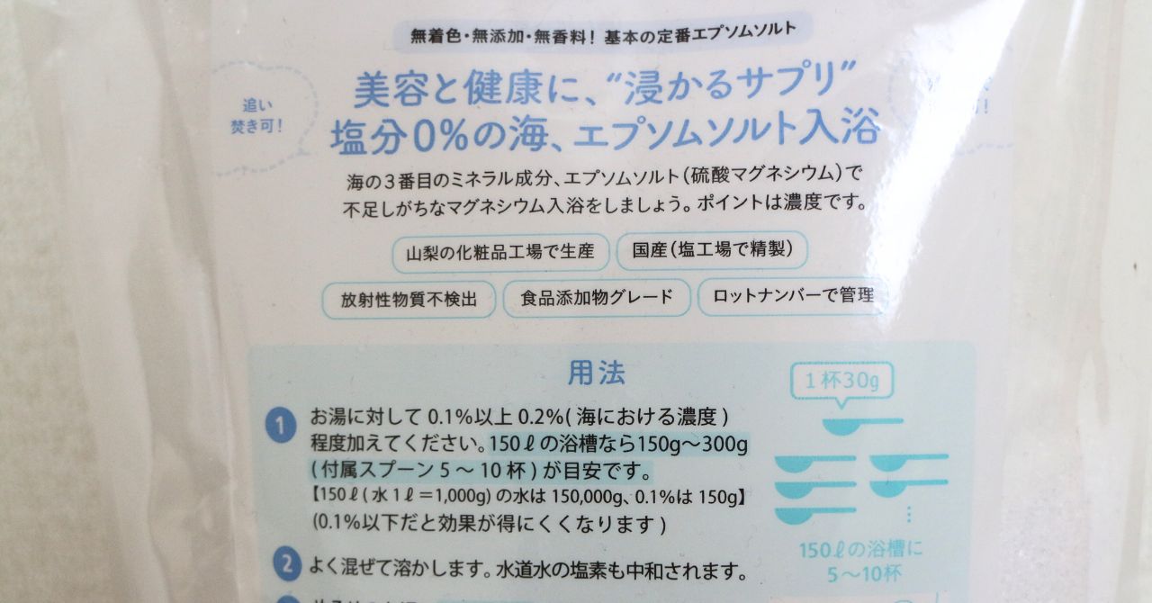 お風呂のお湯(約150L)に約300gのエプソムソルトを入れると