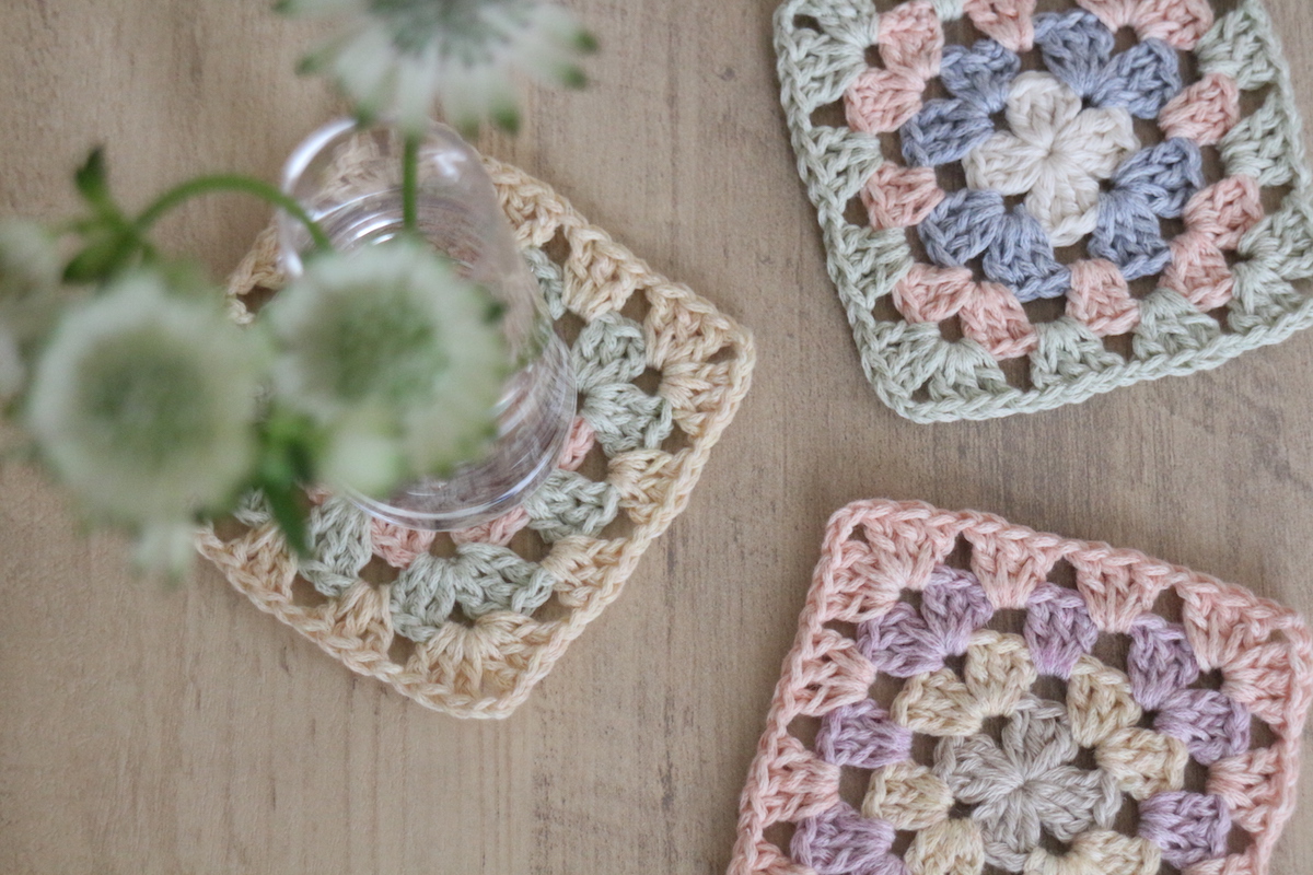 さて、今日はグラニースクエアで編む、四角いコースターを紹介したいと思います。