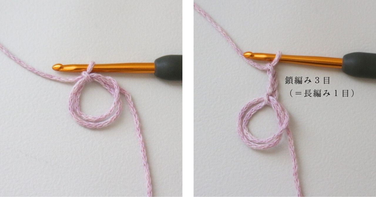 作り目に続けて、立ち上がりの鎖編みを3目編みます。1段目と同じようにこの鎖編み3目は長編み1目と数えます。