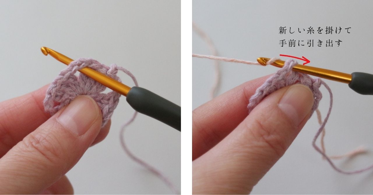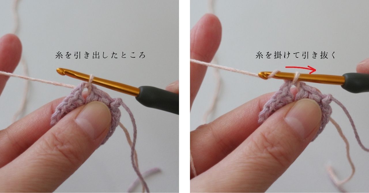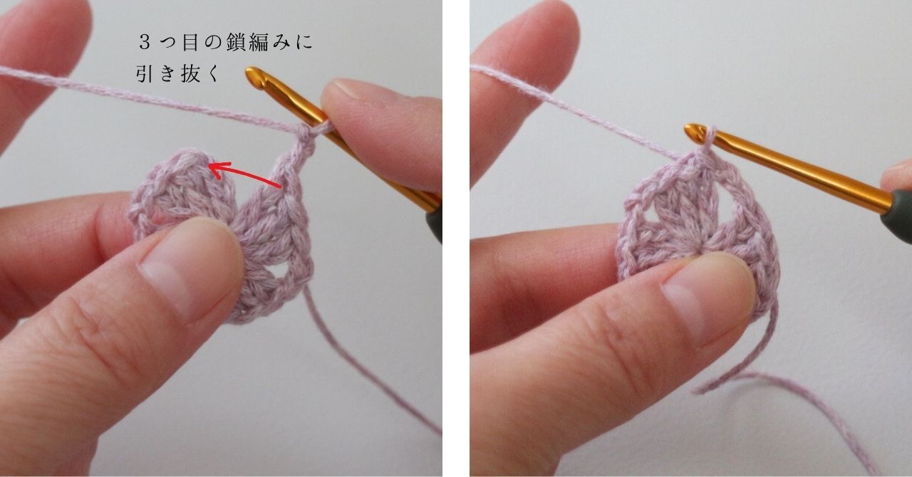 かぎ針を編み目に戻し、立ち上がりの鎖編み3番目に引き抜きます。