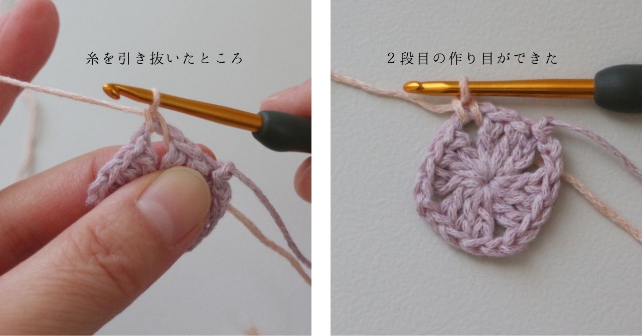 丸く編む編み方は下記の記事で紹介していますので、あわせてご覧いただくとわかりやすいと思います。