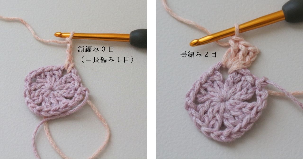 続けて、立ち上がりの鎖編みを3目編みます。この鎖編み3目は長編み1目と数えます。
