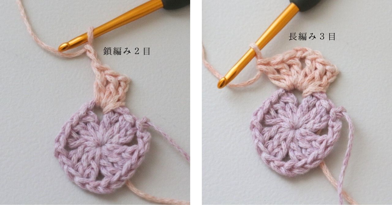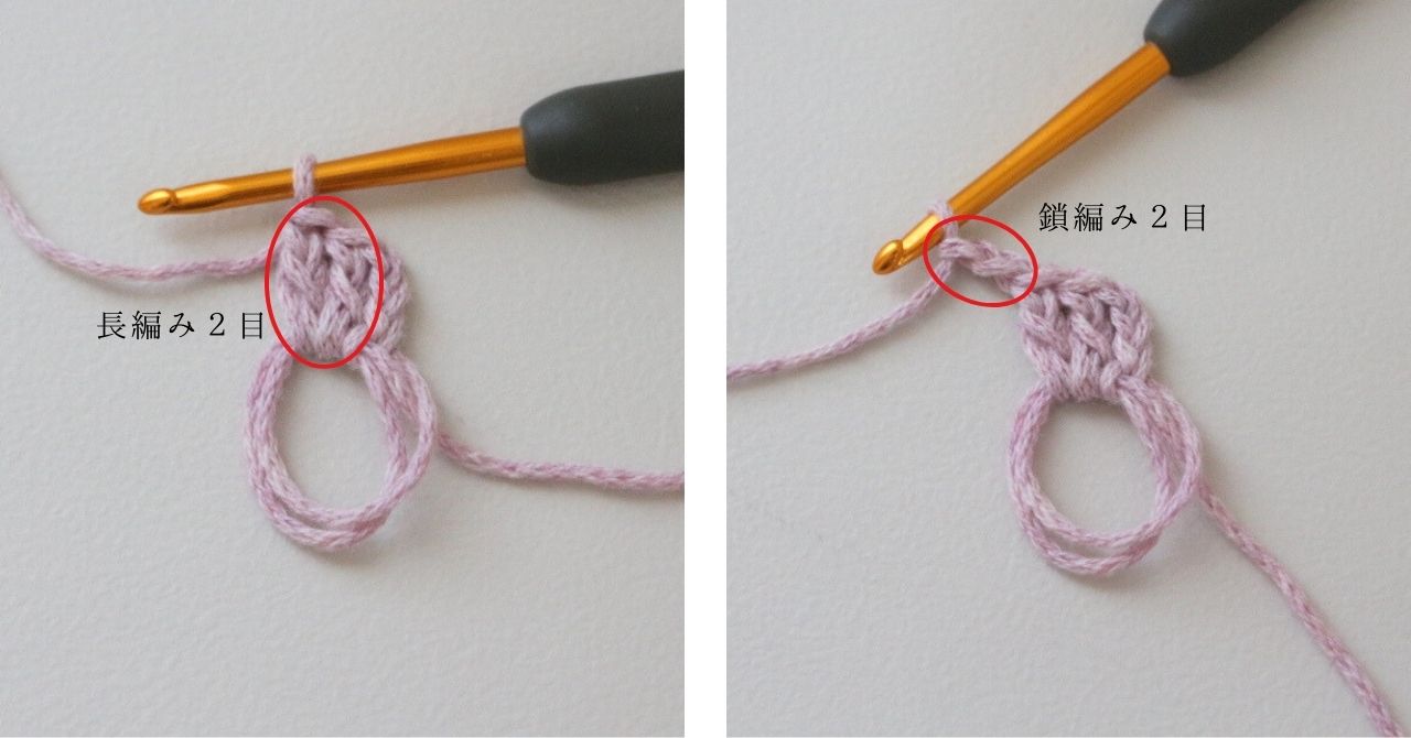 続けて、輪の中心に長編みを2目編んで、鎖編みを2目編みます。