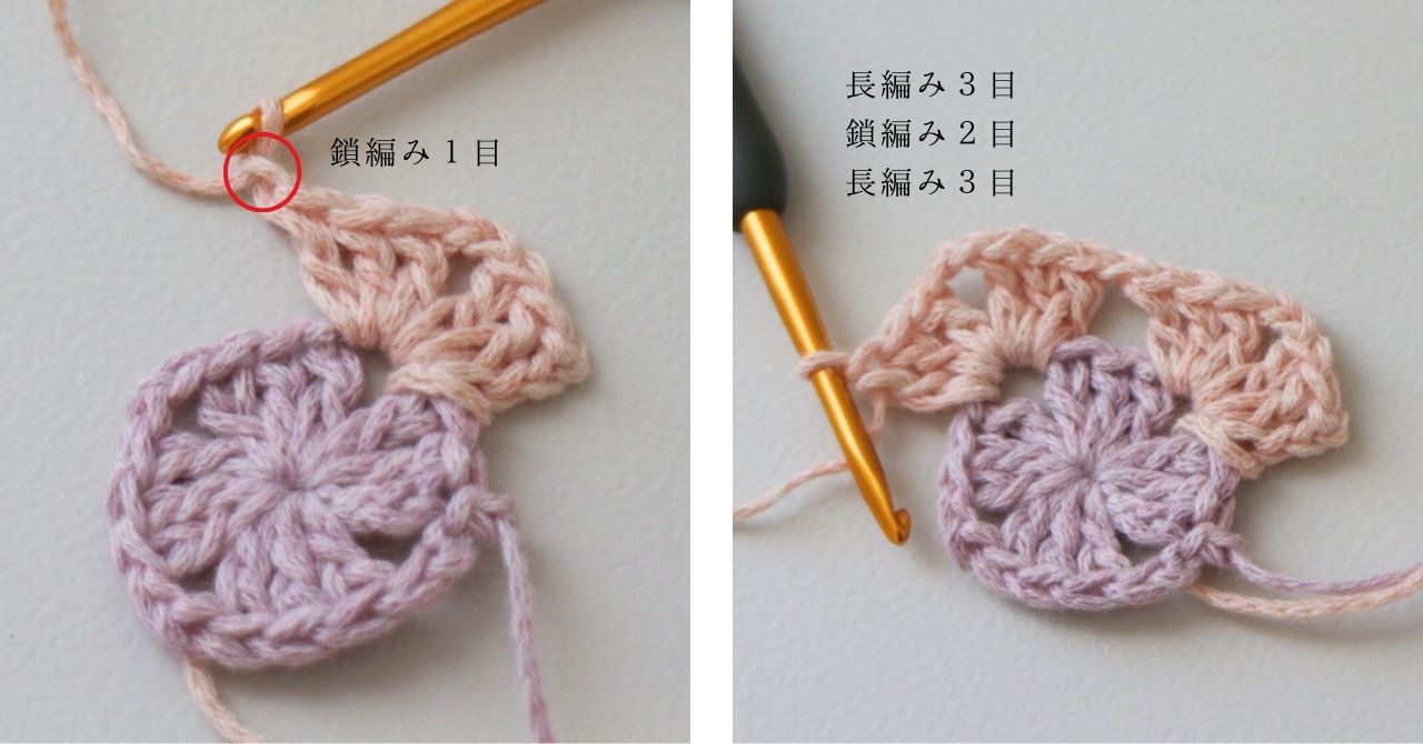 四角形の4つの角には、『長編み3目+鎖編み2目+長編み3目』を編む