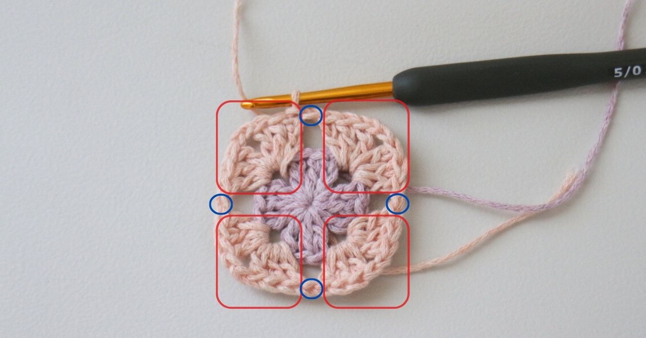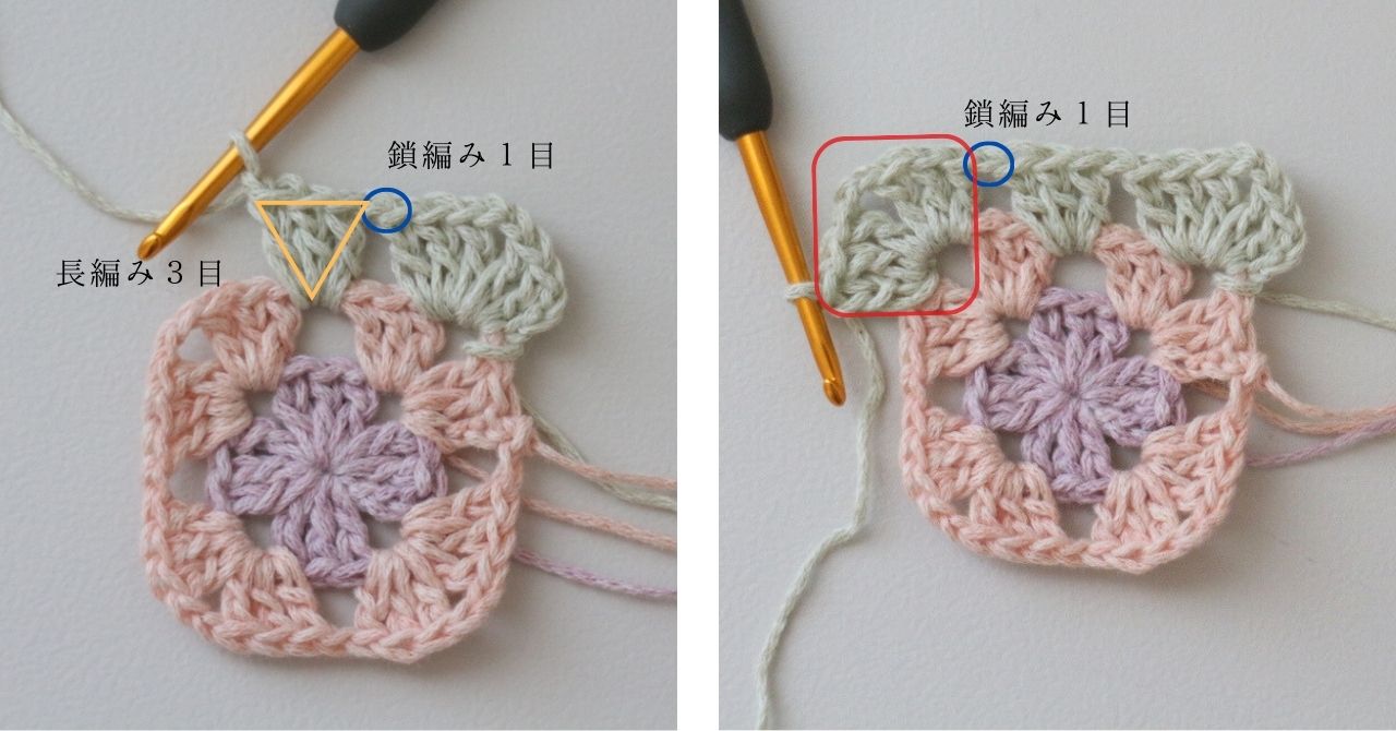 - 四角形の4つの角には、『長編み3目+鎖編み2目+長編み3目』を編む(赤い四角のところ)