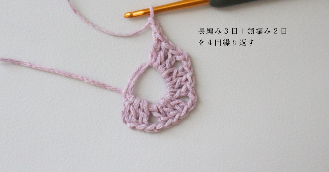長編み3目+鎖編み2目をワンセットとして、これを4回繰り返します。