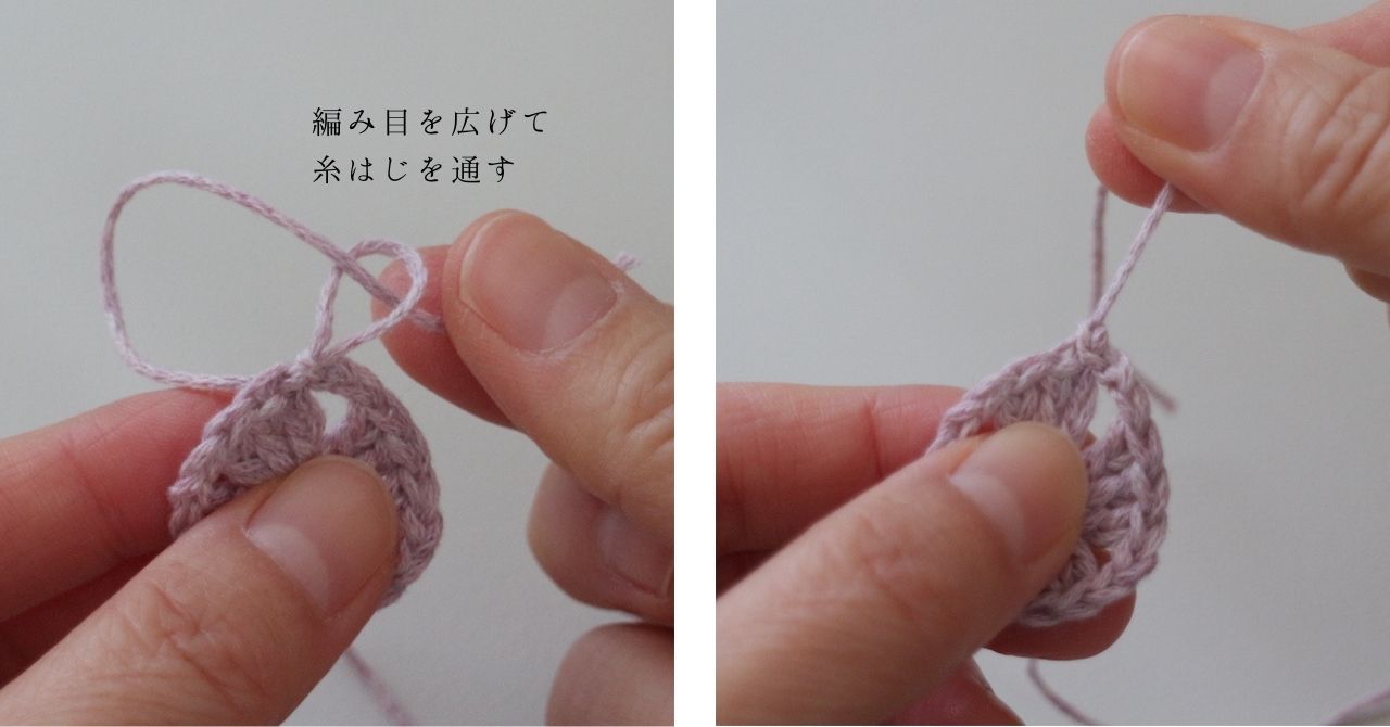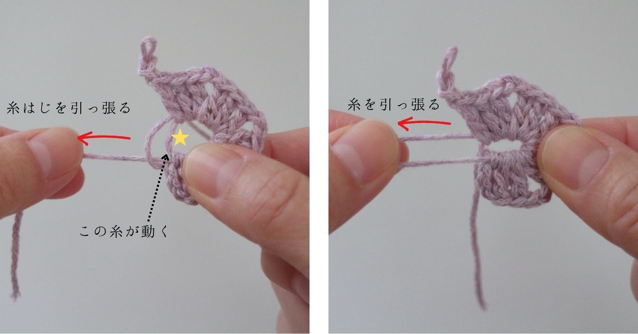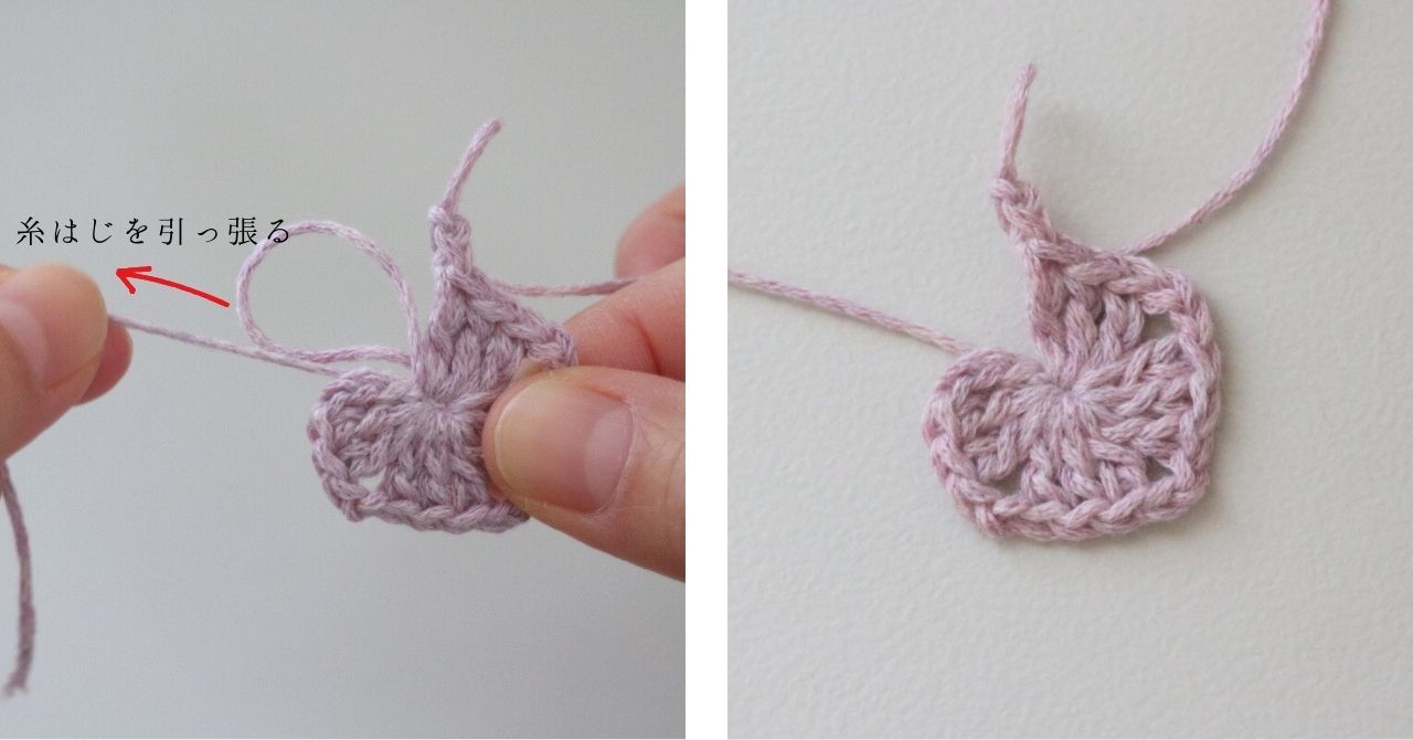 いったんかぎ針を外し、輪の中心を引き締めます。