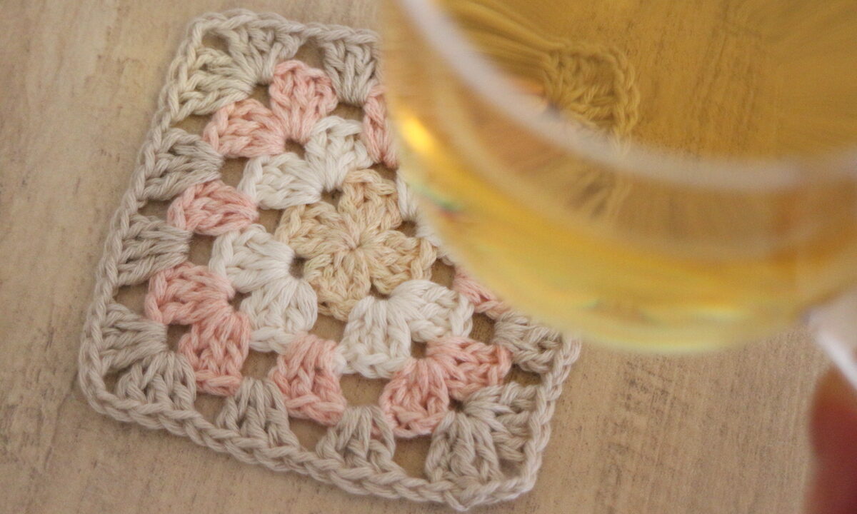 さて、今日はグラニースクエアで編む、四角いコースターを紹介したいと思います。