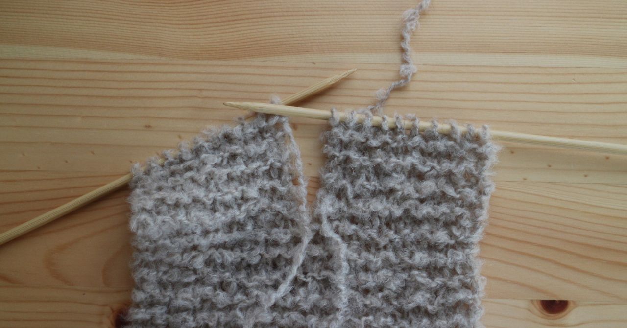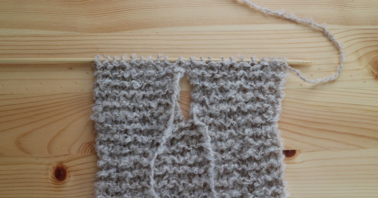 左側を10段編んだら、休ませていた右側に棒針を通して続けて編みます。