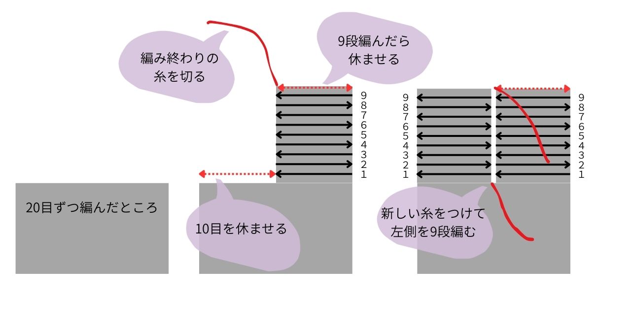 編み始めは20ずつ編みます。通し穴の1段目は右側の10目のみ編み、左側の10目は休ませます。右側のみ9段編んで、糸を切り、休ませます。続けて、新しい糸をつけて、左側を9段編みます。