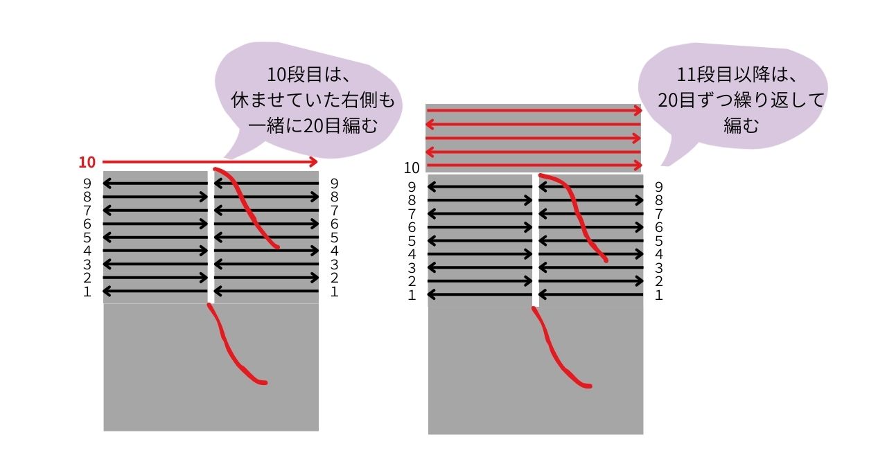 10段目は、休ませていた右側も一緒に20目編みます。11段目以降は20目ずつ繰り返して編んでいきます。