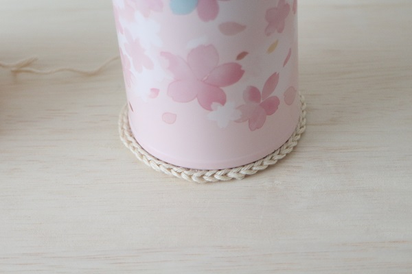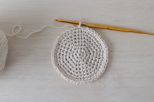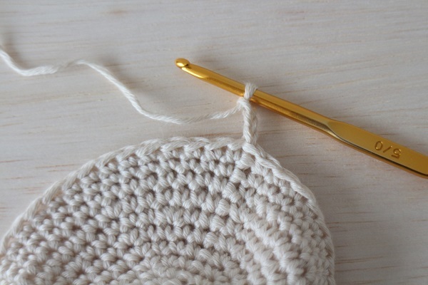 1.まずは水筒の底面の大きさに合わせて円を編みます。丸く編む編み方は下記の記事を参考にしてください。