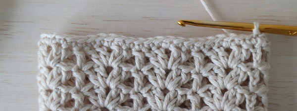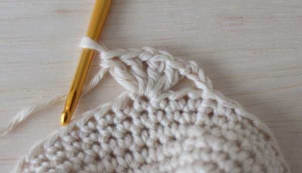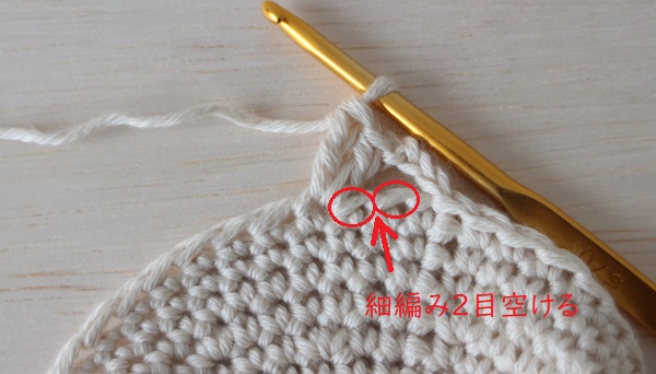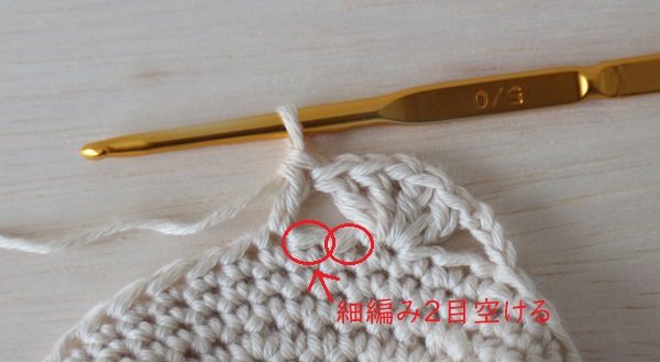 3.前の段の細編み2目空けて、3目めに長編みを2目編みます。