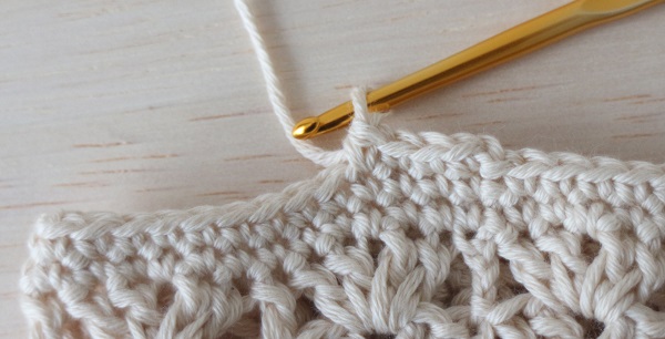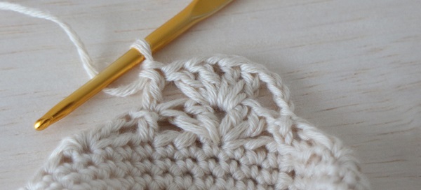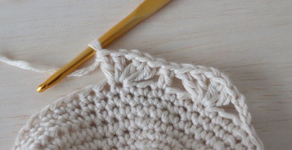 6.前の段の細編み2目空けて長編みを編みます。