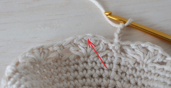9.続けて立ち上がりのくさり3目を編み、前の段のくさり編み(矢印の所)を束に拾って、同じように模様編みを編みます。