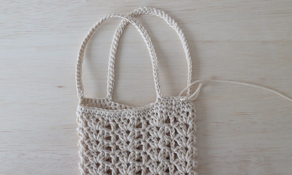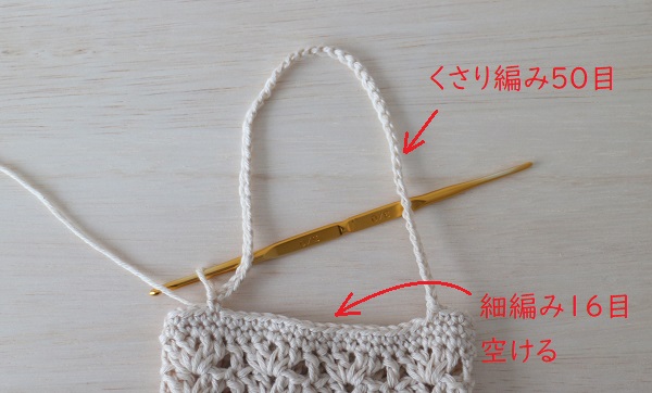 13.続けて細編みで2段編み、3段目に持ち手を付けます。細編みで4目編み、くさり編みで50目編みます。