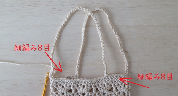 14.続けて細編み8目編んで、反対側の持ち手50目編みます。