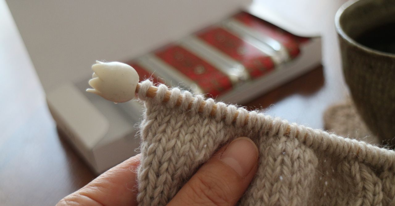編んでいる途中に一休みする時は、編み地が外れないようにこんな風にキャップをしておくんですけど、チューリップの形が可愛くて思わず顔がふにゃふにゃとなります。