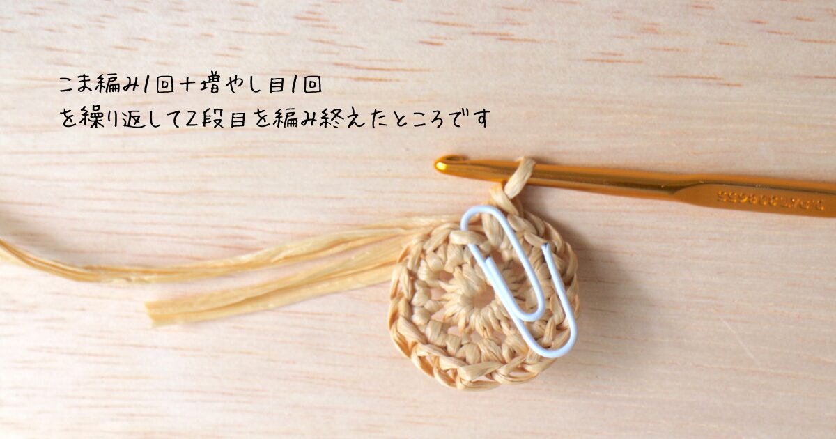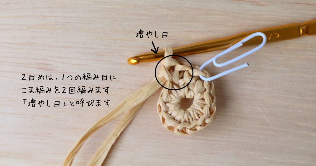 2段目は、こま編み1回+増やし目1回を1セットとして6回繰り返します。
