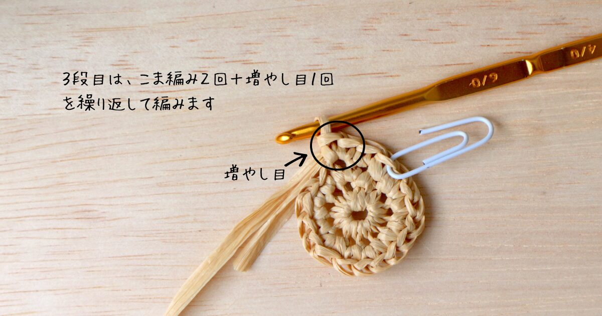 3段目は、こま編み2回+増やし目1回を1セットとして6回繰り返します。