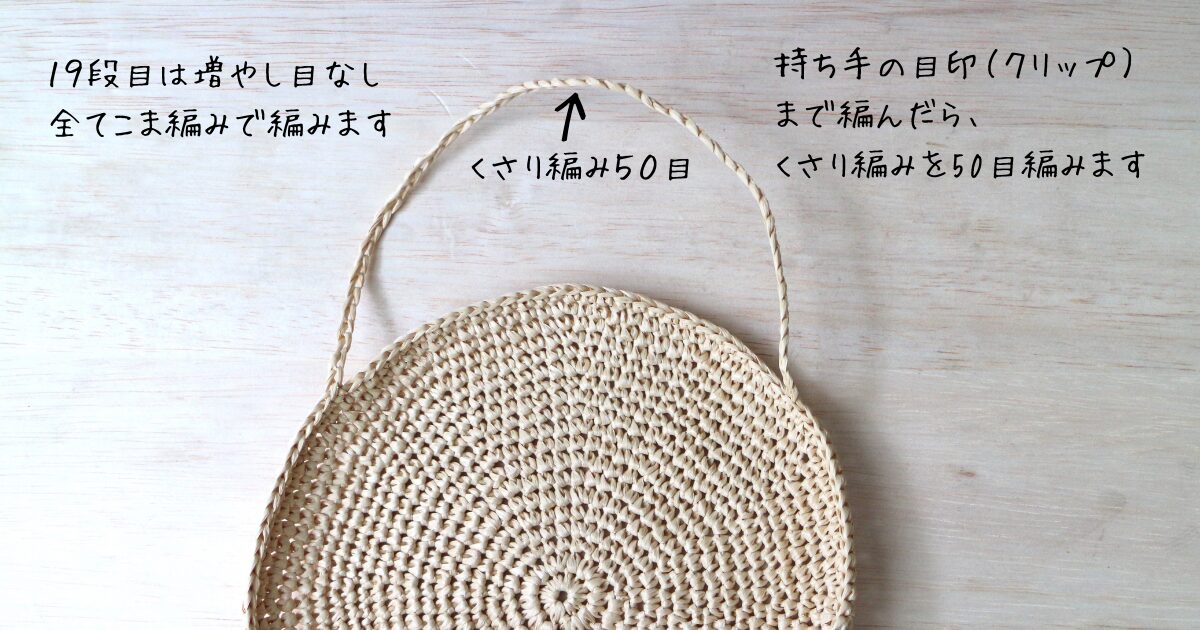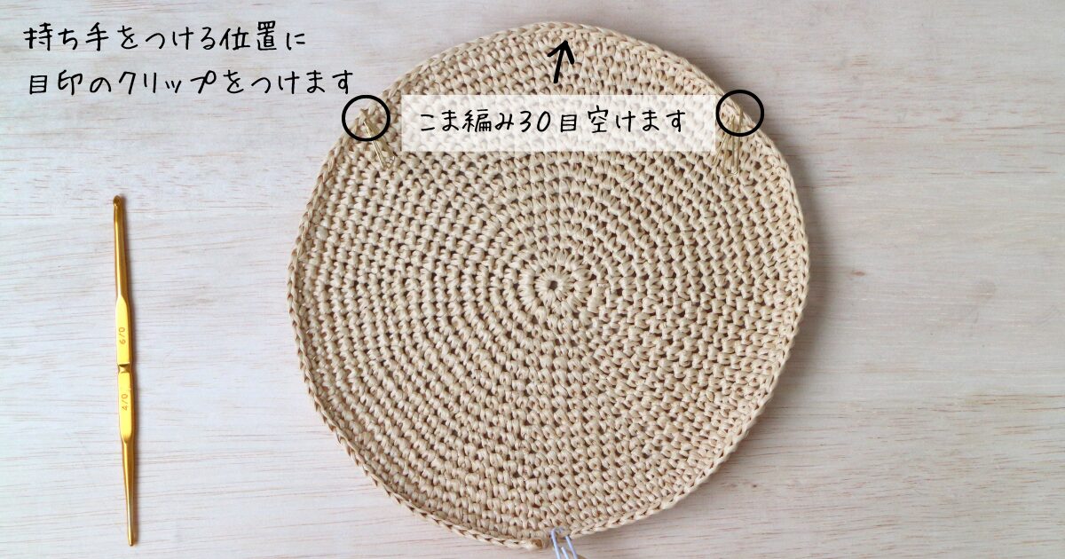 持ち手と持ち手の間は、こま編み30目ぶん空けました。