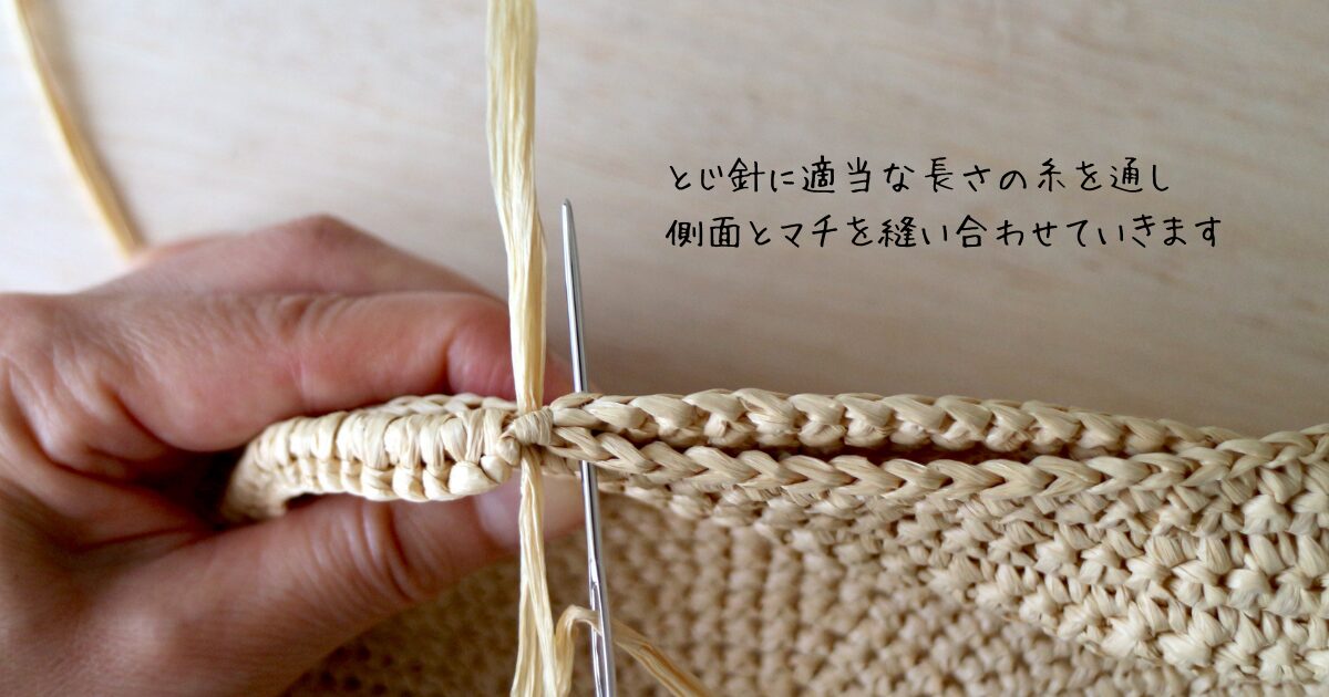 持ち手の下にマチを合わせて、1目づつ針を通しながらかがっていきます。