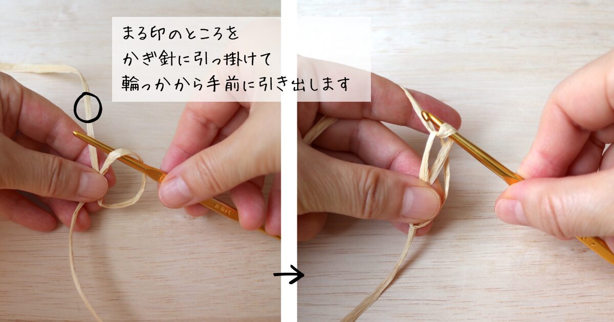 輪っかにかぎ針を通して、まる印のついたところの糸を引っ掛けて、手前に引き出します。