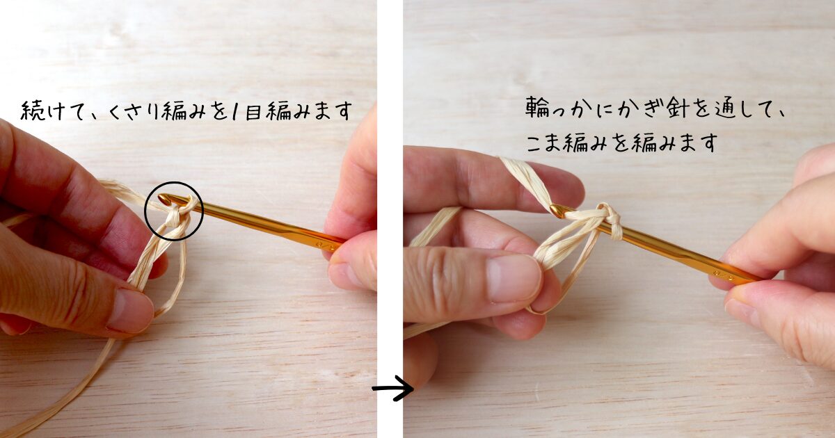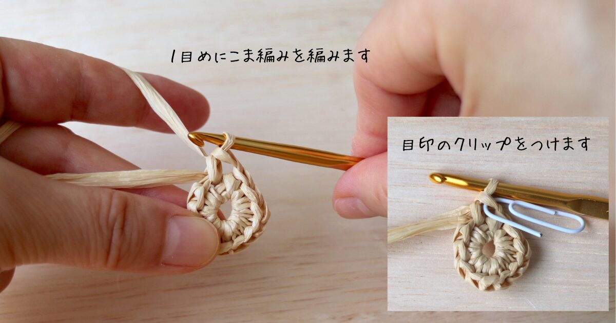 輪っかにかぎ針を通して、こま編みを編みます。
